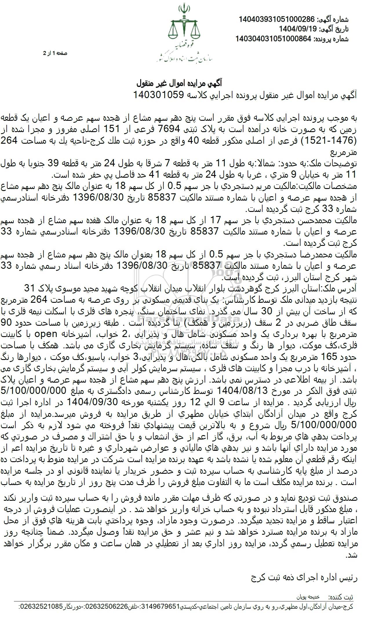 به موجب پرونده اجرایی کلاسه فوق مقرر است پنج دهم سهم مشاع از هجده سهم عرصه و اعیان یک قطعه زمین که به صورت خانه درآمده است به پلاک ثبتی 7694 فرعی از 151 اصلی مفرور و مجرا شده از (1521-1476) فرعی از اصلی مذکور قطعه 40 واقع در حوزه ثبت ملک کرج- ناحیه یک به مساحت 264 متر مربع