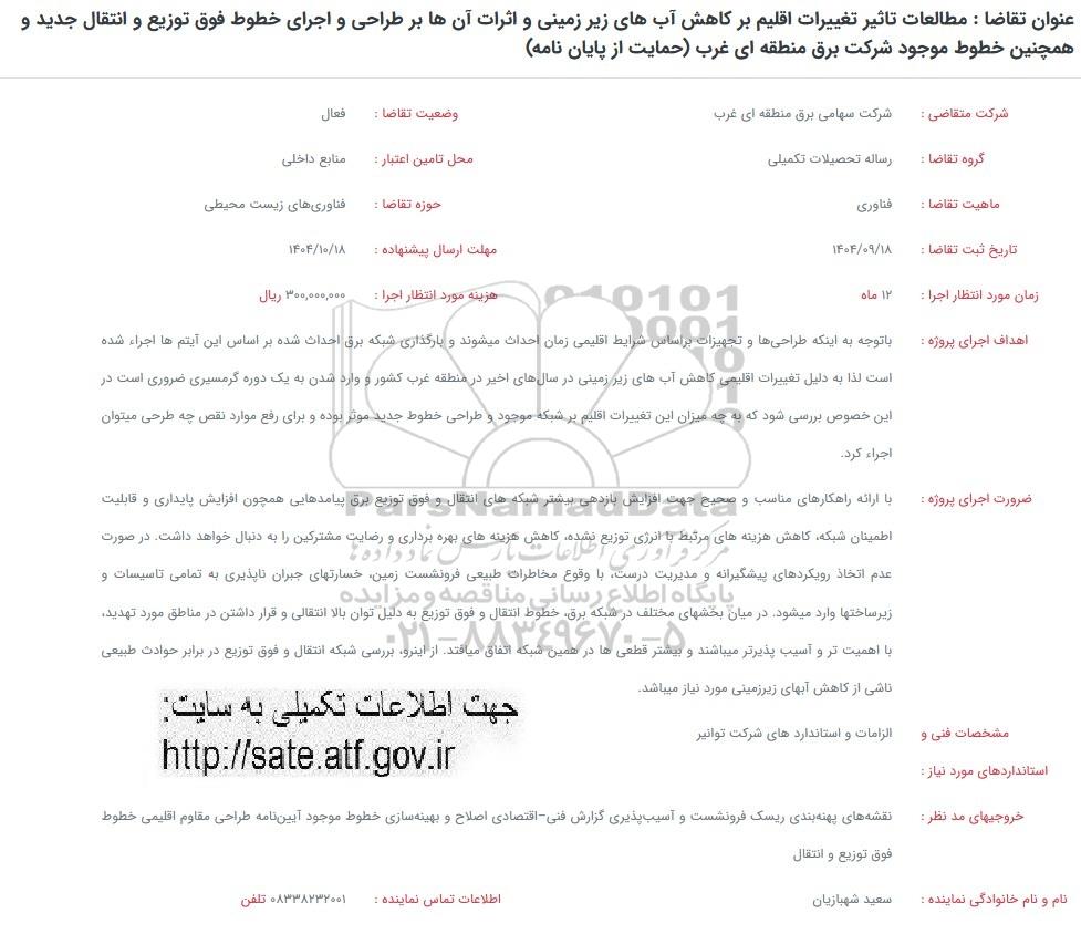 عنوان تقاضا : مطالعات تاثیر تغییرات اقلیم بر کاهش آب های زیرزمینی و اثرات آنها بر طراحی و اجرای خطوط فوق توزیع و انتقال جدید و همچنین خطوط موجود شرکت برق منطقه ای غرب (حمایت از پایان نامه)