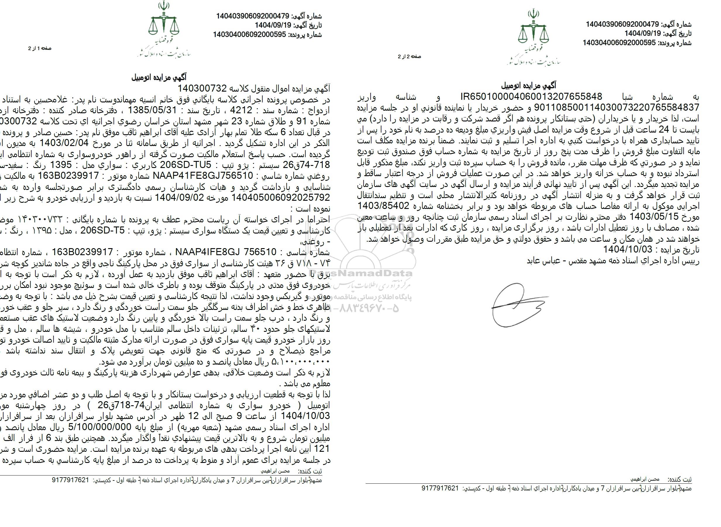لذا با توجه به قطعیت ارزیابی و درخواست بستانکار و با توجه به اصل طلب و دو عشر اضافی مورد من اتومبیل ( خودرو سواری به شماره انتظامی ایران 74-718 ق 26 ) در روز چهارشنبه مو 1404.10.03 از ساعت 9 صبح الی 12 ظهر در آدرس مشهد بلوار سرافرازان بعد از سرافرازان اداره اجرای اسناد رسمی مشهد شعبه مهریه از مبلغ پایه 5.100.000.000 ریال معادل بانصد میلیون تومان شروع و به بالاترین قیمت پیشنهادی نقدا واگذار میگردد. همچنین طبق بند 6 از فراز الف 121 ایین نامه اجرا پرداخت بدهی های مربوطه به عهده برنده مزایده است. مزایده حضوری است و شر در جلسه مزایده برای عموم آزاد و منوط به پرداخت ده درصد از مبلغ پایه کارشناسی به حساب سپرده به شماره شبا IR650100004060013207655848 و شناسه واریز 901108500114030073220765584837 و حضور خریدار با نماینده قانونی او در جلسه مزایده است. لذا خریدار و با خریداران (حتی بستانکار پرونده هم اگر قصد شرکت و رقابت در مزایده را دارد) می بایست تا 24 ساعت قبل از شروع وقت مزایده اصل فیش واریزی مبلغ ودیعه ده درصد به نام خود را پس از تایید حسابداری همراه با درخواست کتبی به اداره اجرا تسلیم و ثبت نمایند. ضمنا برنده مزایده مکلف است ما به التفاوت مبلغ فروش را ظرف مدت پنج روز از تاریخ مزایده به شماره حساب فوق صندوق ثبت تودیع نماید و در صورتی که ظرف مهلت مقرر مانده فروش را به حساب سپرده ثبت واریز نکند، مبلغ مذکور قابل استرداد نبوده و به حساب خزانه واریز خواهد شد. در این صورت عملیات فروش از درجه اعتبار ساقط و مزایده تجدید میگردد. این آگهی پس از تایید نهایی فرایند مزایده و ارسال آگهی در سایت آگهی های سازمان ثبت قرار خواهد گرفت و به منزله انتشار آگهی در روزنامه کثیر الانتشار محلی است و تنظیم سند انتقال اجرایی موکول به ارائه مقاضا حسابهای مربوطه خواهد بود و برابر بخشنامه شماره 1403.85402 مورخ 1403.05.15 دفتر محترم نظارت بر اجرای اسناد رسمی سازمان ثبت چنانچه روز و ساعت معین شده، مصادف با روز تعطیل ادارات باشد. روز برگزاری مزایده روز کاری که ادارات بعد از تعطیلی باز خواهند شد در همان مکان و ساعت میباشد و حقوق دولتی و حق مزایده طبق مقررات وصول خواهد شد.