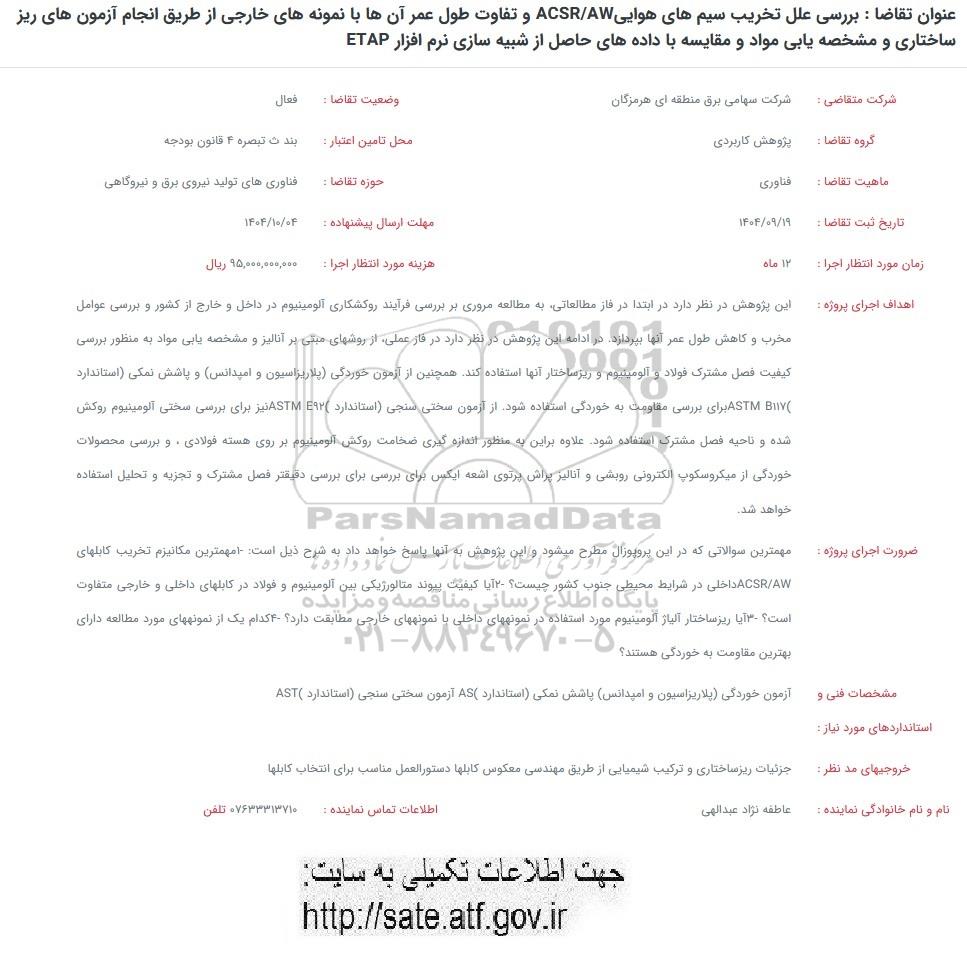 عنوان تقاضا : بررسی علل تخریب سیم های هوایی ACSR/AW و تفاوت طول عمر آن ها با نمونه های خارجی از طریق انجام آزمون های ریز ساختاری و مشخصه یابی مواد و مقایسه با داده های حاصل از شبیه سازی نرم افزار ETAP