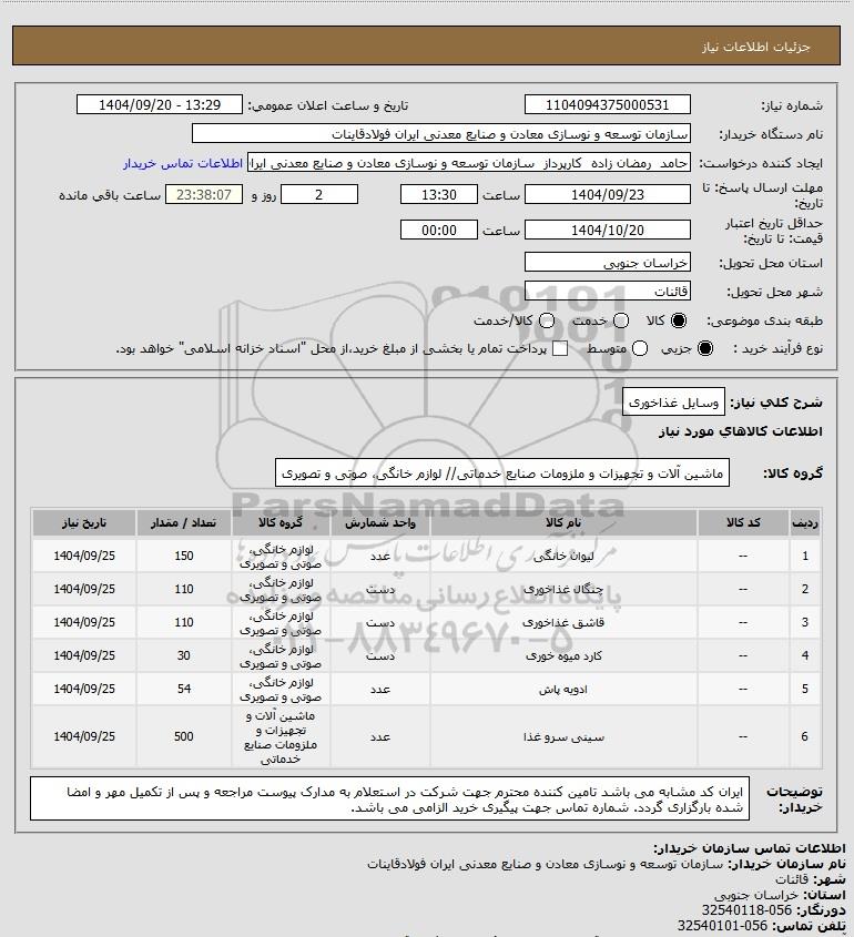 | 6 | -- | سینی سرو غذا | عدد | ماشین آلات و تجهیزات و ملزومات صنایع خدماتی | 500 | 1404/09/25 |