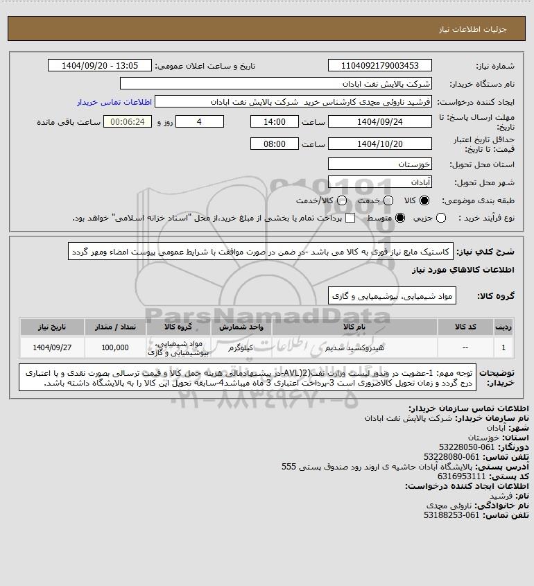 | 1 | -- | هیدروکسید سدیم | کیلوگرم | مواد شیمیایی، بیوشیمیایی و گازی | 100,000 | 1404/09/27 |