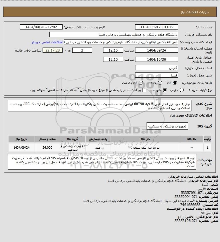 | 1 | -- | پد زیرانداز بیمارستانی | عدد | تجهیزات پزشکی و سلامت | 24,000 | 1404/09/24 |