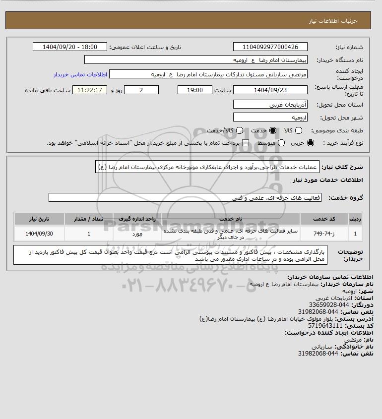 شرح کلی نیاز: عملیات خدمات طراحی،برآورد و اجرای عایقکاری موتورخانه مرکزی بیمارستان امام رضا (ع)