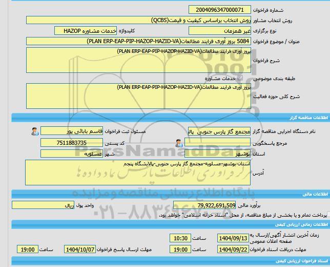 | عنوان/موضوع مناقصه | خرید خدمات مشاوره 5084 بروز آوری فرایند مطالعات(PLAN ERP-EAP-PIP-HAZOP-HAZID-VA) | ||