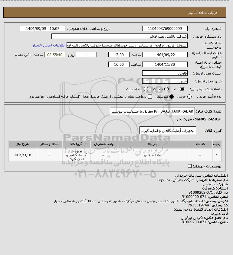 شرح کلی نیاز: P/F SAAB TANK RADAR مطابق با مشخصات پیوست