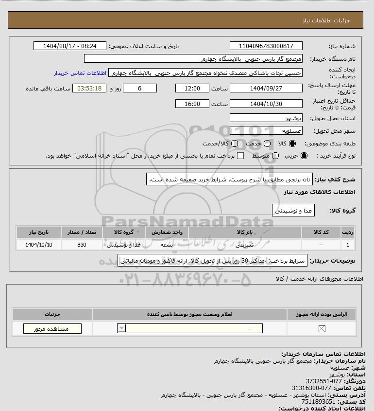 شرح کلی نیاز: نان برنجی مطابق با شرح پیوست. شرایط خرید ضمیمه شده است.