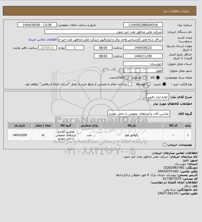 | 1 | -- | رگولاتور هوا | عدد | ماشین آلات و ابزارهای عمومی یا خاص خودرو | 10 | 1404/10/09 |