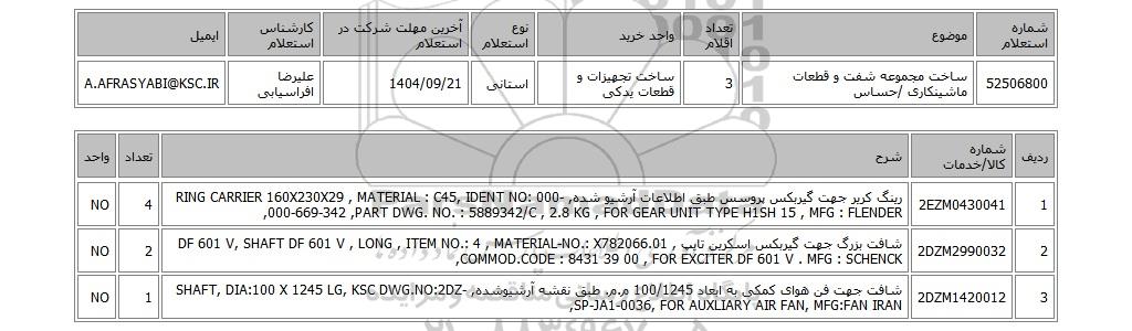 | 52506800 | ساخت مجموعه شفت و قطعات ماشینکاری /حساس | 3 | ساخت تجهیزات و قطعات یدکی | استانی | 1404/09/21 | علیرضا افراسیابی | A.AFRASYABI@KSC.IR |