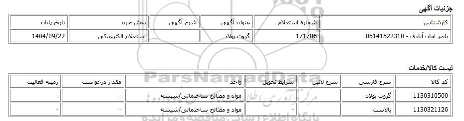 | ناصر امان آبادی - 05141522310 | 171786 | گروت پولاد | استعلام الکترونیکی | 1404/09/22 |