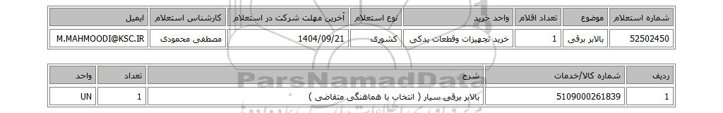 | 52502450 | بالابر برقی | 1 | خرید تجهیزات وقطعات یدکی | کشوری | 1404/09/21 | مصطفی محمودی | M.MAHMOODI@KSC.IR |