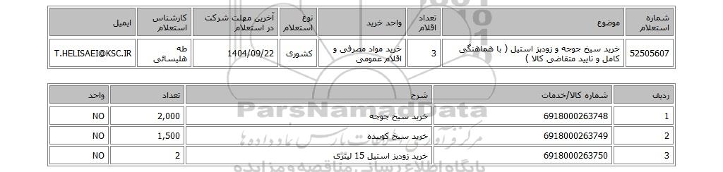 | 52505607 | خرید سیخ جوجه و زودپز استیل ( با هماهنگی کامل و تایید متقاضی کالا ) | 3 | خرید مواد مصرفی و اقلام عمومی | کشوری | 1404/09/22 | طه هلیسائی | T.HELISAEI@KSC.IR |