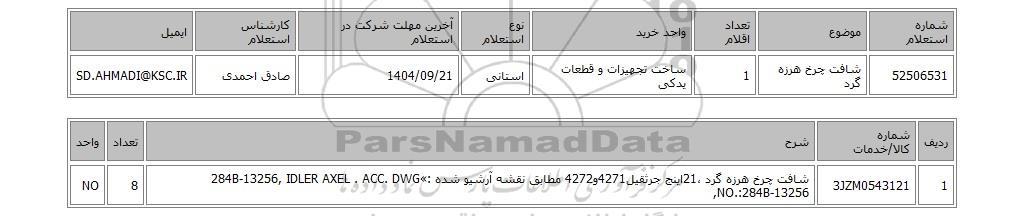 | 52506531 | شافت چرخ هرزه گرد | 1 | ساخت تجهیزات و قطعات یدکی | استانی | 1404/09/21 | صادق احمدی | SD.AHMADI@KSC.IR |