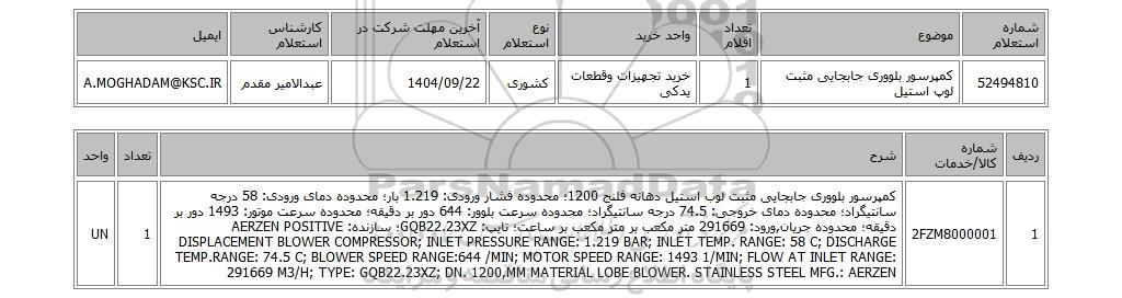 52494810کمپرسور بلووری جابجایی مثبت لوپ استیل1خرید تجهیزات وقطعات یدکیکشوری1404/09/22عبدالامیر مقدمA.MOGHADAM@KSC.IR
