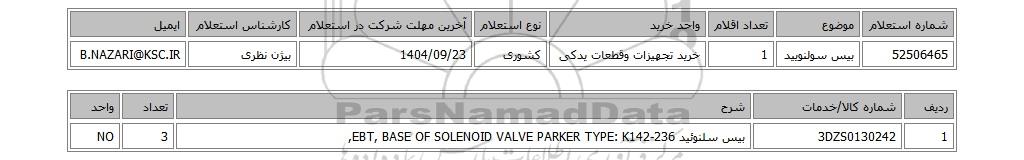 | 52506465 | بیس سولنویید | 1 | خرید تجهیزات وقطعات یدکی | کشوری | 1404/09/23 | بیژن نظری | B.NAZARI@KSC.IR |