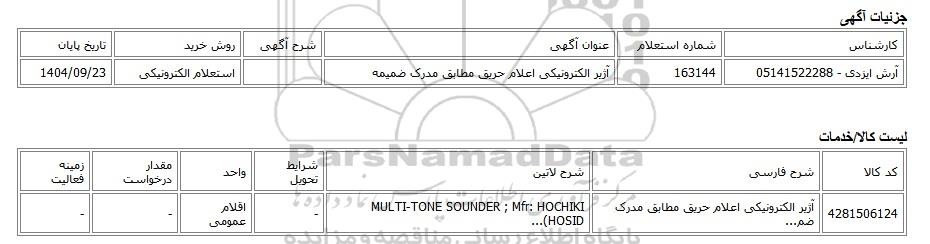 | آرش ایزدی - 05141522288 | 163144 | آژیر الکترونیکی اعلام حریق مطابق مدرک ضمیمه | استعلام الکترونیکی | 1404/09/23 |
