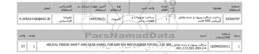 | 52506797 | ساخت شافت پینیون و دنده مقابل گیربکس 400 فلندر | 1 | ساخت تجهیزات و قطعات یدکی | کشوری | 1404/09/21 | علیرضا افراسیابی | A.AFRASYABI@KSC.IR |