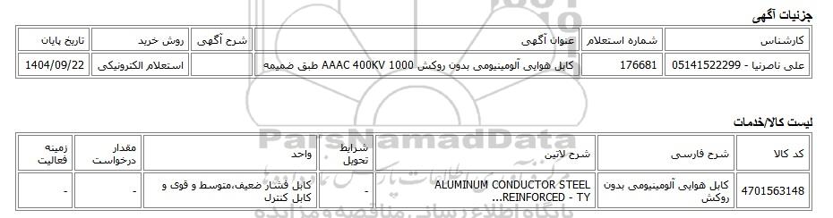 | علی ناصرنیا - 05141522299 | 176681 | کابل هوایی آلومینیومی بدون روکش 1000 AAAC 400KV طبق ضمیمه | استعلام الکترونیکی | 1404/09/22 |