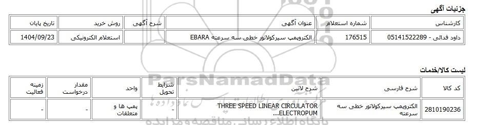 | داود فدائی - 05141522289 | 176515 | الکتروپمپ سیرکولاتور خطی سه سرعته EBARA | استعلام الکترونیکی | 1404/09/23 |