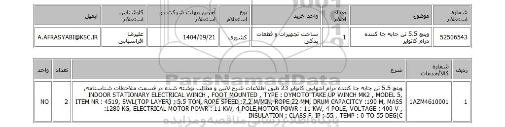 | 52506543 | وینچ 5.5 تن جابه جا کننده درام کانوایر | 1 | ساخت تجهیزات و قطعات یدکی | کشوری | 1404/09/21 | علیرضا افراسیابی | A.AFRASYABI@KSC.IR |