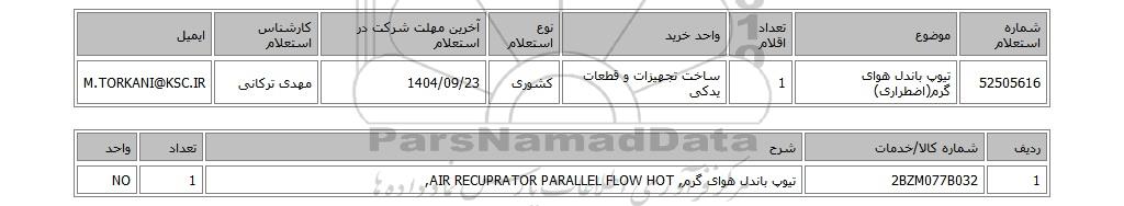 | 52505616 | تیوپ باندل هوای گرم(اضطراری) | 1 | ساخت تجهیزات و قطعات یدکی | کشوری | 1404/09/23 | مهدی ترکانی | M.TORKANI@KSC.IR |