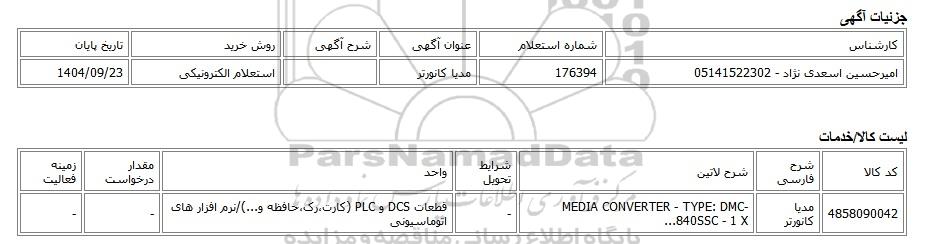 | امیرحسین اسعدی نژاد - 05141522302 | 176394 | مدیا کانورتر | استعلام الکترونیکی | 1404/09/23 |