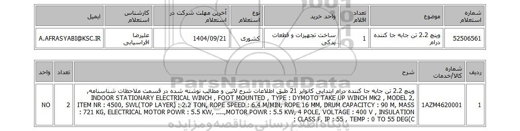 | 52506561 | وینچ 2.2 تن جابه جا کننده درام | 1 | ساخت تجهیزات و قطعات یدکی | کشوری | 1404/09/21 | علیرضا افراسیابی | A.AFRASYABI@KSC.IR |