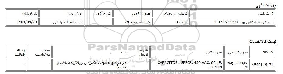 | مصطفی شایگانی پور - 05141522298 | 166731 | خازن استوانه ای | استعلام الکترونیکی | 1404/09/23 |