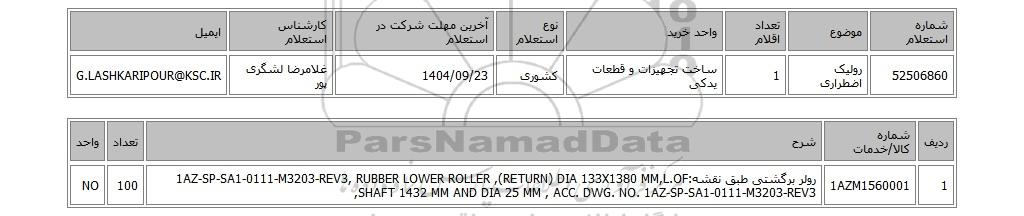 | 52506860 | رولیک اضطراری | 1 | ساخت تجهیزات و قطعات یدکی | کشوری | 1404/09/23 | غلامرضا لشگری پور | G.LASHKARIPOUR@KSC.IR |
