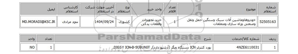 | 52505163 | خودروهاوماشین آلات سبک وسنگین حمل ونقل وصنعتی وراه سازی ومتعلقات | 1 | خرید تجهیزات وقطعات یدکی | کشوری | 1404/09/24 | محمد مرادی | MD.MORADI@KSC.IR |
