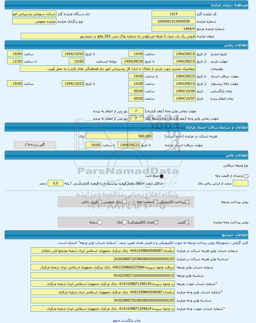 | شماره حساب عودت وجه مزایده | 343039857203900800000000000103 |