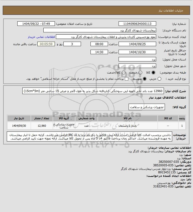 | 1 | -- | بانداژ یا پانسمان | عدد | تجهیزات پزشکی و سلامت | 12,960 | 1404/09/30 |