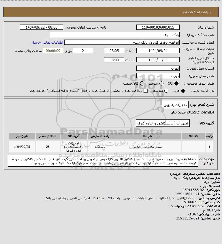 | 1 | -- | تستر تجهیزات رادیویی | دستگاه | تجهیزات آزمایشگاهی و اندازه گیری | 25 | 1404/09/25 |
