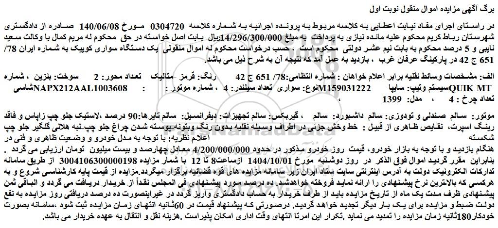 در راستای اجرای مفاد نیابت اعطایی به کلاسه مربوط به پرونده اجرائیه به شماره کلاسه 0304720 مورخ 140/06/08 صادره از دادگستری شهرستان رباط کریم محکوم علیه مائده نیازی به پرداخت به مبلغ 14/296/300/000ریال بابت اصل خواسته در حق محکوم له مریم کمال با وکالت سعید نایبی و 5 درصد محکوم به بابت نیم عشر دولتی محکوم است ، حسب درخواست محکوم له اموال منقولی یک دستگاه سواری کوییک به شماره ایران 78/ 651 ج 42 در پارکینگ عرفان غرب ، بازدید به عمل آمد که نتیجه آن به شرح ذیل می باشد.