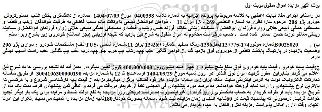 در راستای اجرای مفاد نیابت اعطایی به کلاسه مربوط به پرونده اجرائیه به شماره کلاسه 0400338 مورخ 1404/07/09 صادره از دادگستری بخش آفتاب دستورفروش خودرو پژو 206 مرحوم سارا نظری به شماره انتظامی 269 د 13 ایران 11 ، خواهان ابوالفضل ذبیحی با وکالت خانم سمیه فاضلی به طرفیت خواندگان زینب و فاطمه و مصطفی همگی ذبیحی جلالی زواره فرزندان ابوالفضل و سکینه زینالی مغانلو فرزند حسن زینب و فاطمه و مصطفی همگی ذبیحی جلالی زواره فرزندان ابوالفضل و سکینه زینالی مغانلو فرزند حسن صادر شده است ، حسب درخواست محکوم له اموال منقول به شرح ذیل بازدید که نتیجه ارزیابی (بجز اصالت) خودروی زیر بشرح زیر است: