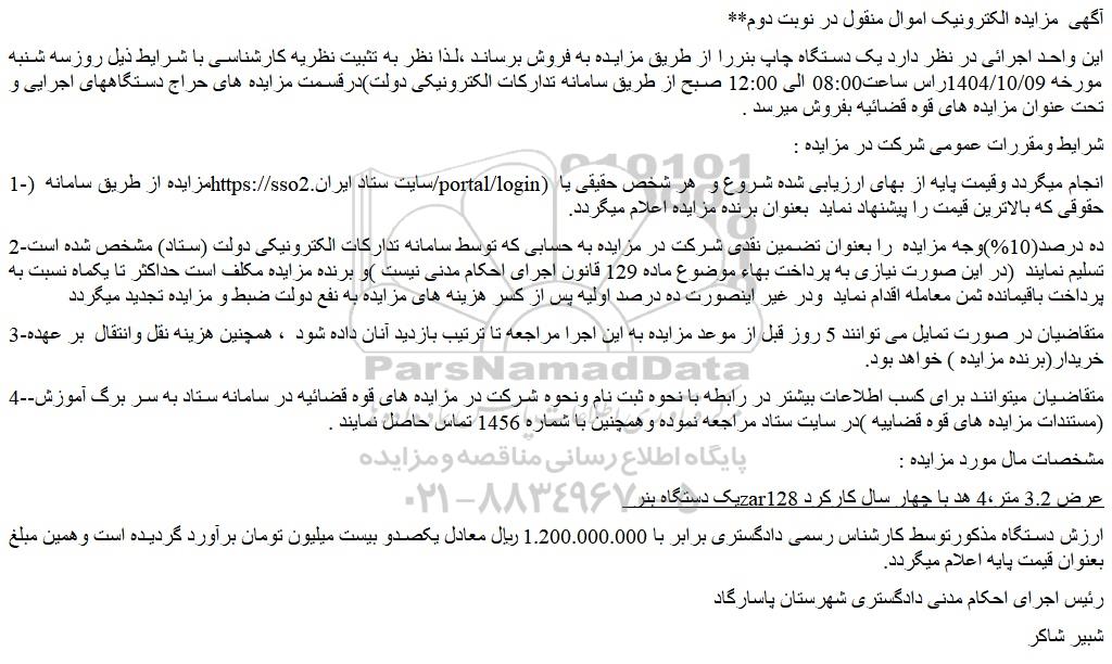 این واحد اجرائی در نظر دارد یک دستگاه چاپ بنر را از طریق مزایده به فروش برساند ،لذا نظر به تثبیت نظریه کارشناسی با شرایط ذیل روزسه شنبه مورخه 1404/10/09راس ساعت08:00 الی 12:00 صبح از طریق سامانه تدارکات الکترونیکی دولت)درقسمت مزایده های حراج دستگاههای اجرایی و تحت عنوان مزایده های قوه قضائیه بفروش میرسد .