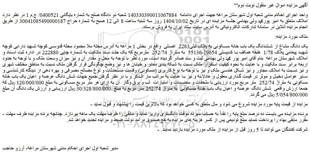 واحد اجرای احکام مدنی شعبه اول شهرستان مراغه جهت اجرای دادنامه 140330390011067884 شعبه دو دادگاه صلح به شماره بایگانی 0400521/ ج.م 1 در نظر دارد املاک متعلق به امیر پورمحمد ولی بهنامی جلسه مزایده ای در تاریخ 1404/10/02 روز سه شنبه ساعت 8 الی 12 صبح به شماره حراج 30041085490000187 از طریق انجام مزایده آنلاین در سامانه تدارکات الکترونیکی به آدرس سایت ستاد ایران به فروش برساند.