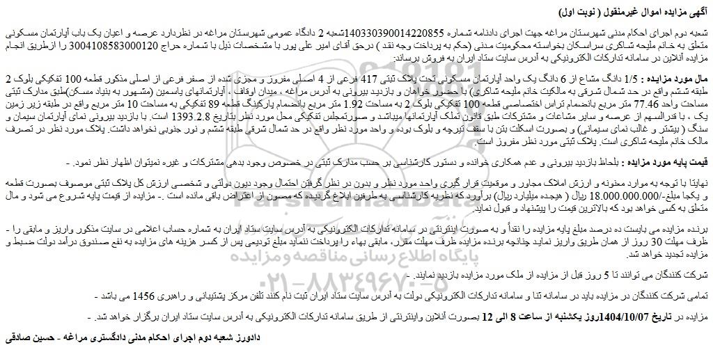 شعبه دوم اجرای احکام مدنی شهرستان مراغه جهت اجرای دادنامه شماره 140330390014220855شعبه 2 دادگاه عمومی شهرستان مراغه در نظردارد عرصه و اعیان یک باب آپارتمان مسکونی متعلق به خانم ملیحه شاکری سراسکان بخواسته محکومیت مدنی (حکم به پرداخت وجه نقد ) درحق آقای امیر علی پور با مشخصات ذیل با شماره حراج 3004108583000120 را ازطریق انجام مزایده آنلاین در سامانه تدارکات الکترونیکی به آدرس سایت ستاد ایران به فروش برساند: