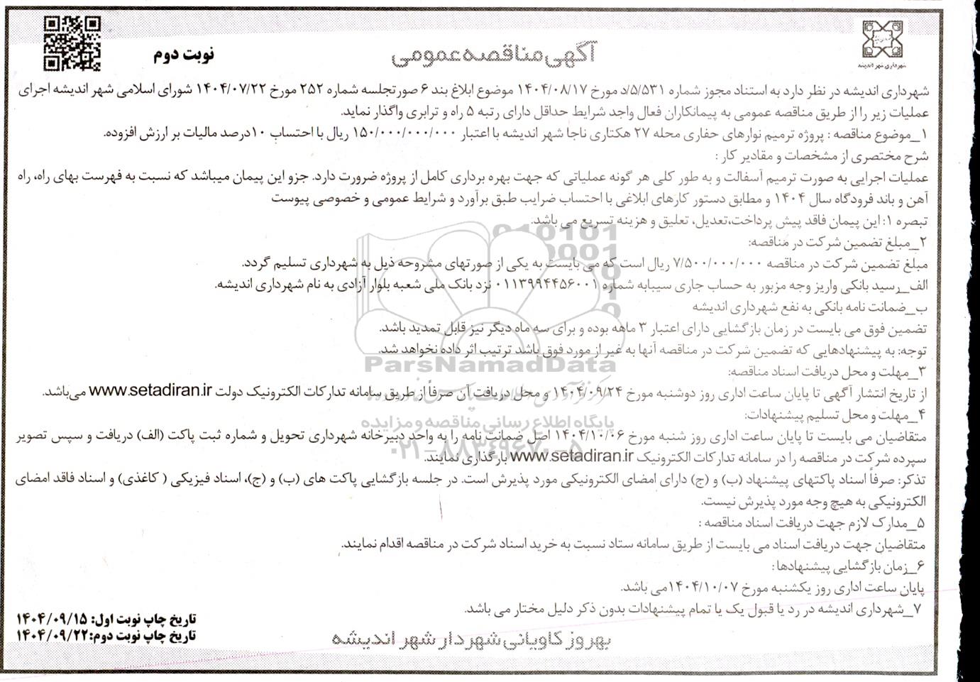 شهرداری اندیشه در نظر دارد به استناد مجوز شماره 5.531 د مورخ 1404.08.17 موضوع ابلاغ بند 6 صورتجلسه شماره 252 مورخ 1404.07.22 شورای اسلامی شهر اندیشه اجرای عملیات زیر را از طریق مناقصه عمومی به پیمانکاران فعال واجد شرایط حداقل دارای رتبه 5 راه و ترابری واگذار نماید.