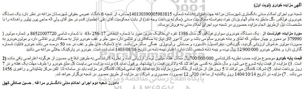 شعبه دوم اجرای احکام مدنی دادگستری شهرستان مراغه جهت اجرای دادنامه شماره 140130390005983815صادره از شعبه 6 دادگاه عمومی حقوقی شهرستان مراغه در نظر دارد یک دستگاه خودروی فولکس -گل متعلق به خانم الهام یزدان خواه بخواسته محکومیت مدنی (حکم به پرداخت وجه نقد) از بابت محکومیت آقای علی اعظمیان اقدم در حق آقای ولی اله حاجی پور پیلور راهدانه را با مشخصات ذیل ازطریق انجام مزایده حضوری در شعبه دوم اجرای احکام مدنی به فروش برساند: