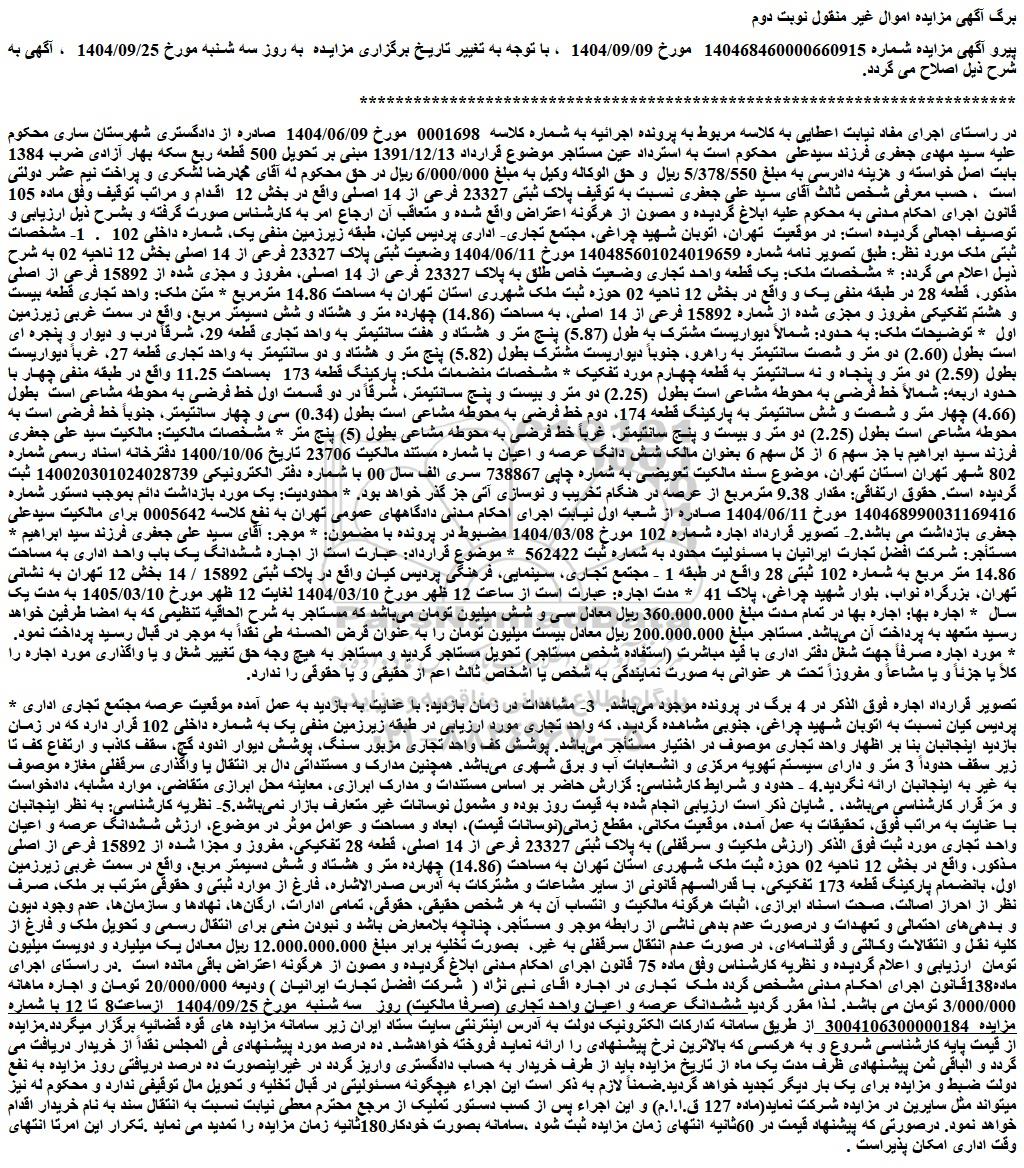 * تصویر قرارداد اجاره فوق الذکر در 4 برگ در پرونده موجود می باشد.  3- مشاهدات در زمان بازدید: با عنایت به بازدید به عمل آمده موقعیت عرصه مجتمع تجاری اداری پردیس کیان نسبت به اتوبان شهید چراغی، جنوبی مشاهده گردید، که واحد تجاری مورد ارزیابی در طبقه زیرزمین منفی یک به شماره داخلی 102 قرار دارد که در زمان بازدید اینجانبان بنا بر اظهار واحد تجاری موصوف در اختیار مستأجر می باشد. پوشش کف واحد تجاری مزبور سنگ، پوشش دیوار اندود گچ، سقف کاذب و ارتفاع کف تا زیر سقف حدوداً 3 متر و دارای سیستم تهویه مرکزی و انشعابات آب و برق شهری می باشد. همچنین مدارک و مستنداتی دال بر انتقال یا واگذاری سرقفلی مغازه موصوف به غیر به اینجانبان ارائه نگردید.4 - حدود و شرایط کارشناسی: گزارش حاضر بر اساس مستندات و مدارک ابرازی، معاینه محل ابرازی متقاضی، موارد مشابه، دادخواست و مرّ قرار کارشناسی می باشد، . شایان ذکر است ارزیابی انجام شده به قیمت روز بوده و مشمول نوسانات غیر متعارف بازار نمی باشد.5- نظریه کارشناسی: به نظر اینجانبان با عنایت به مراتب فوق، تحقیقات به عمل آمده، موقعیت مکانی، مقطع زمانی(نوسانات قیمت)، ابعاد و مساحت و عوامل موثر در موضوع، ارزش ششدانگ عرصه و اعیان واحد تجاری مورد ثبت فوق الذکر (ارزش ملکیت و سرقفلی) به پلاک ثبتی 23327 فرعی از 14 اصلی، قطعه 28 تفکیکی، مفروز و مجزا شده از 15892 فرعی از اصلی مذکور، واقع در بخش 12 ناحیه 02 حوزه ثبت ملک شهرری استان تهران به مساحت (14.86) چهارده متر و هشتاد و شش دسیمتر مربع، واقع در سمت غربی زیرزمین اول، بانضمام پارکینگ قطعه 173 تفکیکی، با قدرالسهم قانونی از سایر مشاعات و مشترکات به آدرس صدرالاشاره، فارغ از موارد ثبتی و حقوقی مترتب بر ملک، صرف نظر از احراز اصالت، صحت اسناد ابرازی، اثبات هرگونه مالکیت و انتساب آن به هر شخص حقیقی، حقوقی، تمامی ادارات، ارگان ها، نهاد ها و سازمان ها، عدم وجود دیون و بدهی های احتمالی و تعهدات و درصورت عدم بدهی ناشی از رابطه موجر و مستأجر، چنانچه بلامعارض باشد و نبودن منعی برای انتقال رسمی و تحویل ملک و فارغ از کلیه نقل و انتقالات وکالتی و قولنامه ای، در صورت عدم انتقال سرقفلی به غیر،  بصورت تخلیه برابر مبلغ 12.000.000.000 ریال معادل یک میلیارد و دویست میلیون تومان  ارزیابی و اعلام گردیده و نظریه کارشناس وفق ماده 75 قانون اجرای احکام مدنی ابلاغ گردیده و مصون از هرگونه اعتراض باقی مانده است  .در راستای اجرای ماده138قانون اجرای احکام مدنی مشخص گردد ملک  تجاری در اجاره اقای نبی نژاد (  شرکت افضل تجارت ایرانیان ) ودیعه 20/000/000 تومان و اجاره ماهانه 3/000/000 تومان می باشد. لذا مقرر گردید ششدانگ عرصه و اعیان واحد تجاری (صرفا مالکیت) روز   سه شنبه  مورخ 1404/09/25  ازساعت8 تا 12 با شماره مزایده  3004106300000184  از طریق سامانه تدارکات الکترونیک دولت به آدرس اینترنتی سایت ستاد ایران زیر سامانه مزایده های قوه قضائیه برگزار میگردد.مزایده از قیمت پایه کارشناسی شروع و به هرکسی که بالاترین نرخ پیشنهادی را ارائه نماید فروخته خواهدشد. ده درصد مورد پیشنهادی فی المجلس نقداً از خریدار دریافت می گردد و الباقی ثمن پیشنهادی ظرف مدت یک ماه از تاریخ مزایده باید از طرف خریدار به حساب دادگستری واریز گردد در غیراینصورت ده درصد دریافتی روز مزایده به نفع دولت ضبط و مزایده برای یک بار دیگر تجدید خواهد گردید.ضمناً لازم به ذکر است این اجراء هیچگونه مسئولیتی در قبال تخلیه و تحویل مال توقیفی ندارد و محکوم له نیز میتواند مثل سایرین در مزایده شرکت نماید(ماده 127 ق.ا.ا.م) و این اجراء پس از کسب دستور تملیک از مرجع محترم معطی نیابت نسبت به انتقال سند به نام خریدار اقدام خواهد نمود. درصورتی که پیشنهاد قیمت در 60ثانیه انتهای زمان مزایده ثبت شود ،سامانه بصورت خودکار180ثانیه زمان مزایده را تمدید می نماید .تکرار این امرتا انتهای وقت اداری امکان پذیراست .