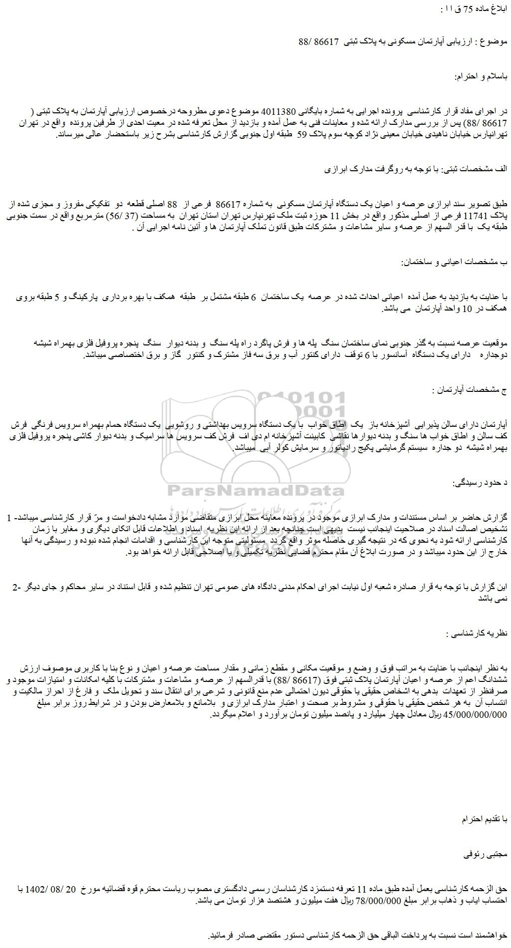 در اجرای مفاد قرار کارشناسی پرونده اجرایی به شماره بایگانی 4011380 موضوع دعوی مطروحه درخصوص ارزیابی آپارتمان به پلاک ثبتی ( 86617 /88) پس از بررسی مدارک ارائه شده و معاینات فنی به عمل آمده و بازدید از محل تعرفه شده در معیت احدی از طرفین پرونده واقع در تهران تهرانپارس خیابان ناهیدی خیابان معینی نژاد کوچه سوم پلاک 59 طبقه اول جنوبی گزارش کارشناسی بشرح زیر باستحضار عالی میرساند.