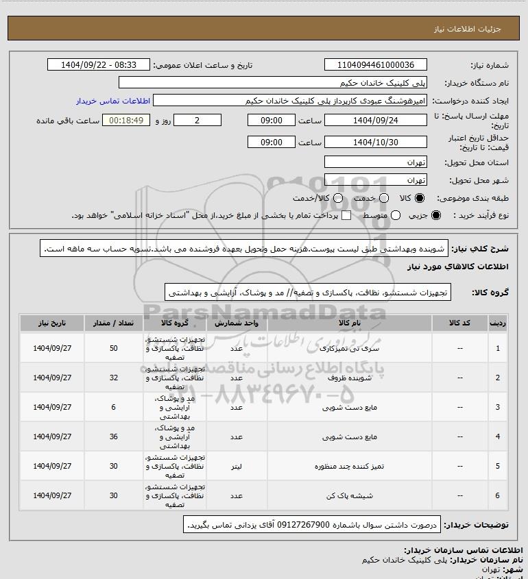 استعلام بها و موضوع استعلام استعلام شوینده وبهداشتی طبق لیست پیوست.هزینه حمل وتحویل بعهده فروشنده می باشد.تسویه حساب سه ماهه است. به اطلاع کلیه شرکتها و افراد متخصص واجد شرایط میرساند، آگهی گذار در نظر دارد از طریق استعلام بها، نسبت به انتخاب و دریافت پیشنهادات اقدام نماید. این استعلام با کد آگهی ثبت شده در سامانه خبرگزاری پارس نماد : 9984442 منتشر شده است. مشخصات استعلام : تاریخ شروع استعلام: 1404/09/22 آخرین مهلت ارسال پیشنهاد قیمت : 1404/09/24 و محل اجرای پروژه : استان تهران میباشد. استعلام قیمت مورد درخواست : استعلام شوینده وبهداشتی طبق لیست پیوست.هزینه حمل وتحویل بعهده فروشنده می باشد.تسویه حساب سه ماهه است. با دستهبندیهای تخصصی و گروه های مرتبط : لوازم بهداشتی, استعلام اطلاع رسانی میگردد.