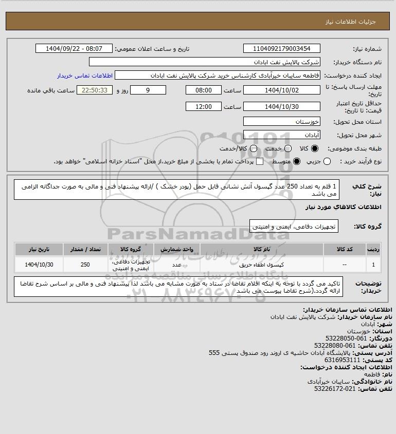 شرح کلی نیاز: 1 قلم به تعداد 250 عدد گپسول آتش نشانی قابل حمل (پودر خشک ) /ارائه پیشنهاد فنی و مالی به صورت جداگانه الزامی می باشد