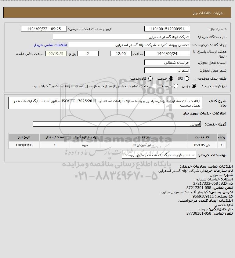 شرح کلی نیاز: ارائه خدمات مشاوره،آموزش،طراحی و پیاده سازی الزامات استاندارد ISO/IEC 17025:2017 مطابق اسناد بارگذاری شده در بخش پیوست