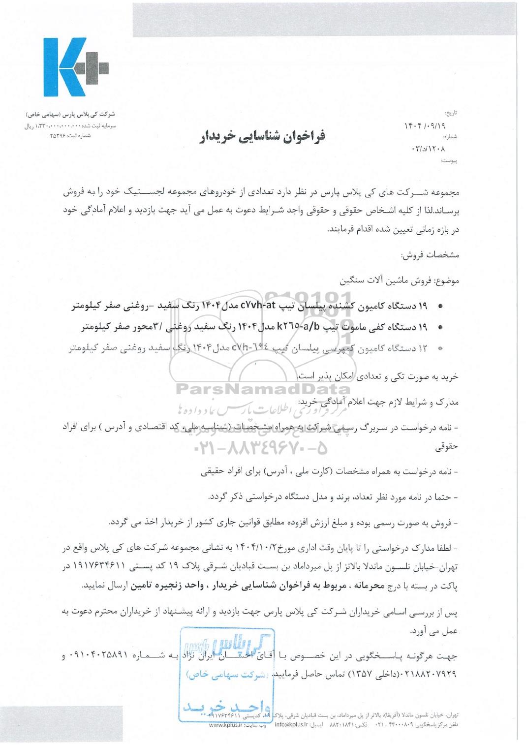 مجموعه شرکت های کی پلاس پارس در نظر دارد تعدادی از خودروهای مجموعه لجستیک خود را به فروش برساند. لذا از کلیه اشخاص حقوقی و حقوقی واجد شرایط دعوت به عمل می آید جهت بازدید و اعلام آمادگی خود در بازه زمانی تعیین شده اقدام فرمایند.
