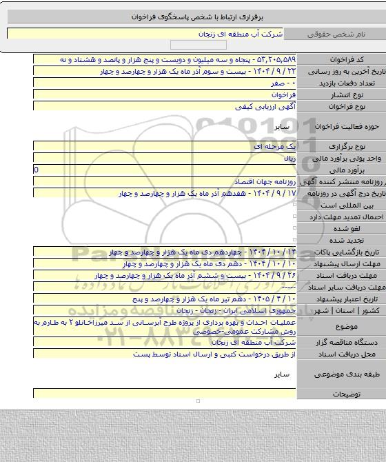مناقصه عملیات احداث و بهره برداری از پروژه طرح آبرسانی از سد میرزاخانلو ۲ به طارم به روش مشارکت عمومی-خصوصی, مناقصه, عملیات احداث و بهره برداری از پروژه طرح آبرسانی از سد میرزاخانلو ۲ به طارم به روش مشارکت عمومی-خصوصی