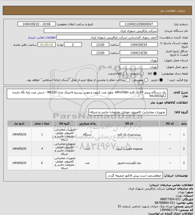 شرح کلی نیاز: یک دستگاه پرینتر A3تک کاره HPm706n- چهار عدد کیبورد و موس بیسیم لاجیتک مدل MK220 - شش عدد پایه نگه دارنده آرگوWLA003
