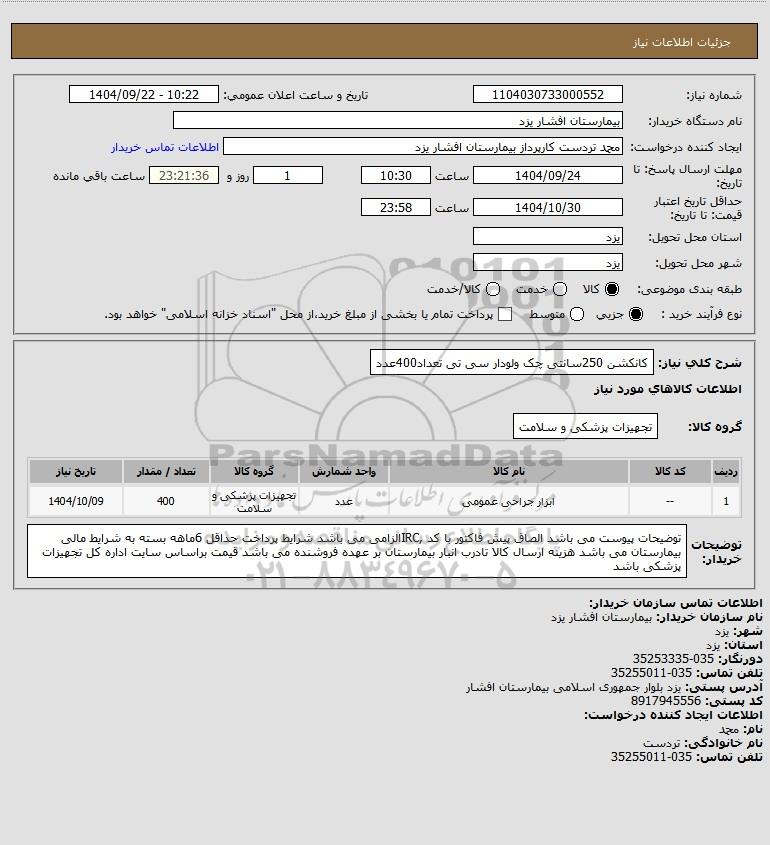 شرح کلی نیاز: کانکشن 250سانتی چک ولودار سی تی تعداد400عدد