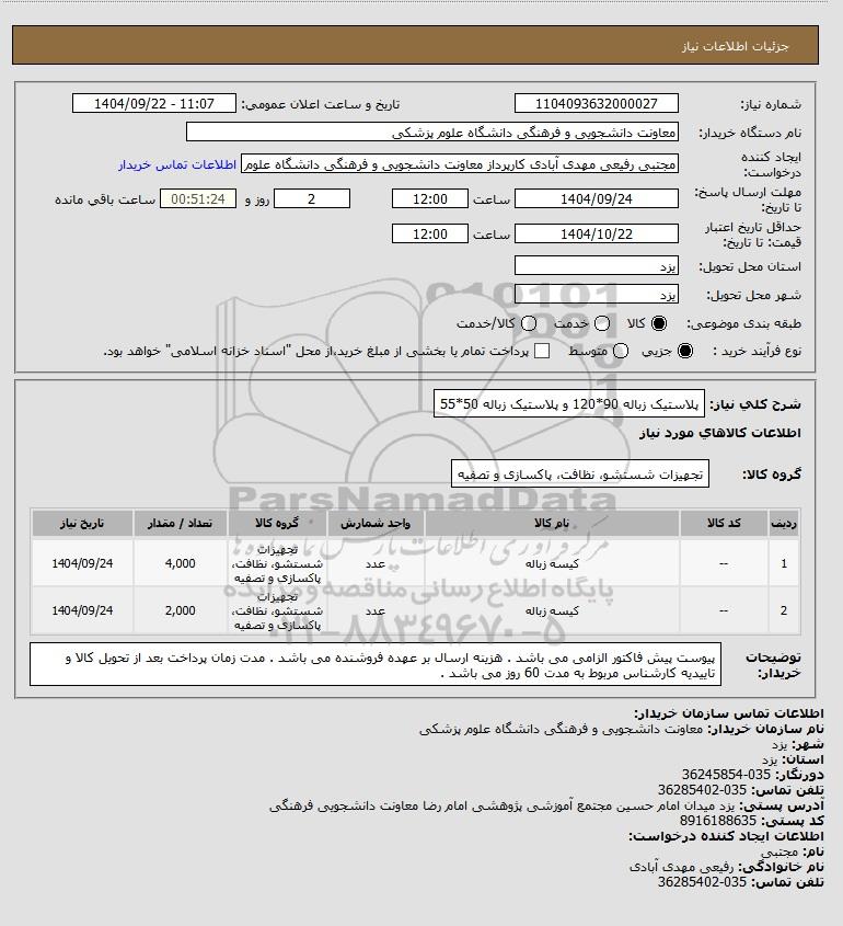 | 1 | -- | کیسه زباله | عدد | تجهیزات شستشو، نظافت، پاکسازی و تصفیه | 4,000 | 1404/09/24 |